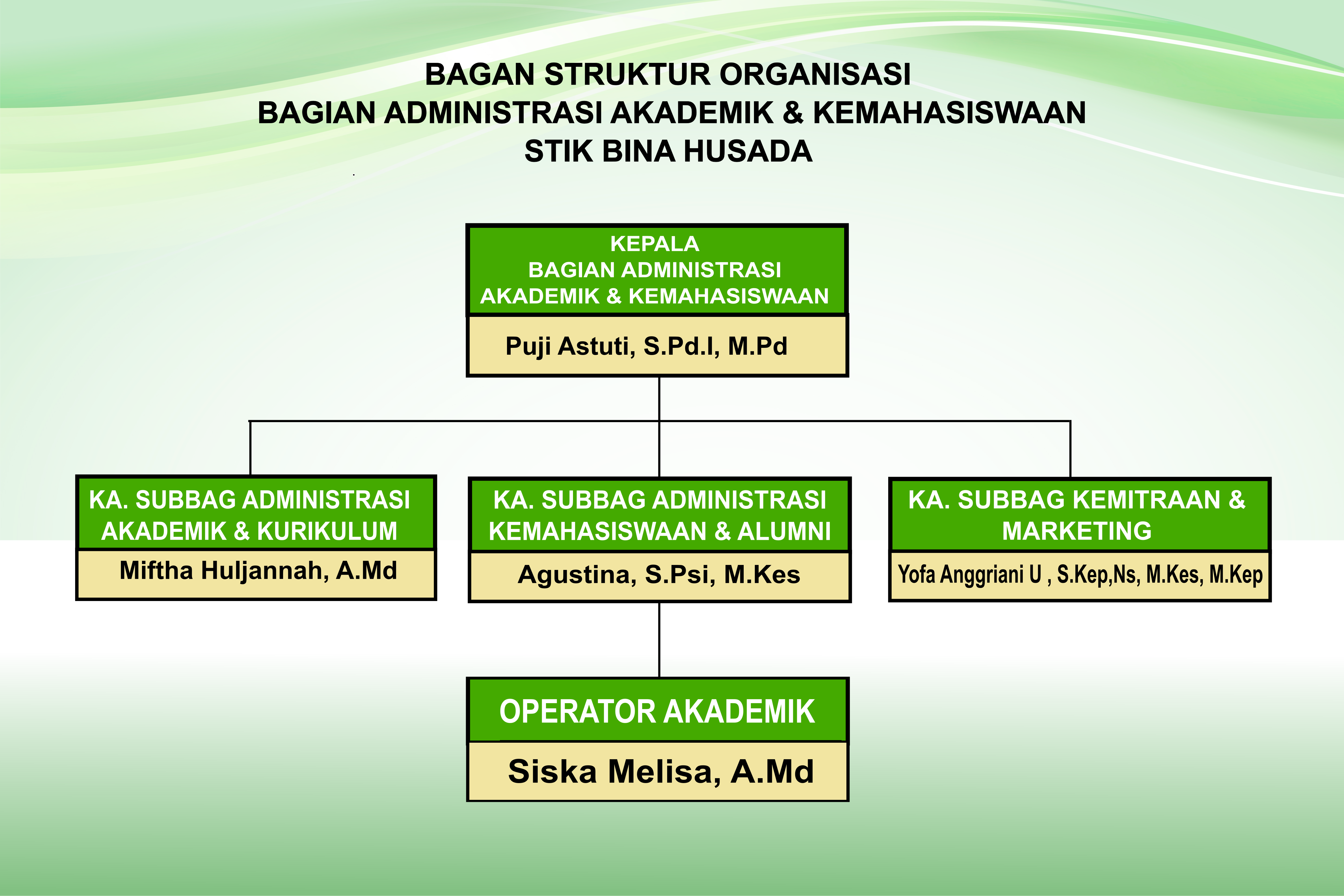Untuk memperlancar kegiatan pembelajaran dan kampus, unit Administrasi Akademik memiliki struktur organisasi yang lengkap, melayani kegiatan administrasi mahasiswa
